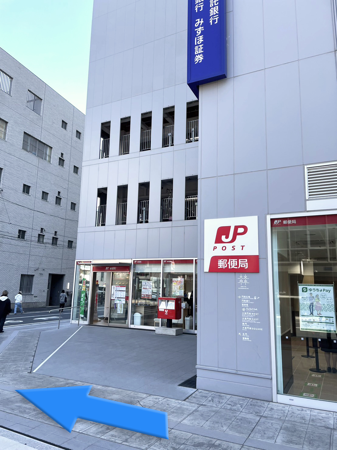 大通りまで真っ直ぐ進むと、交差点の向かいに大宮門街ビルがあります。郵便局が目印です。