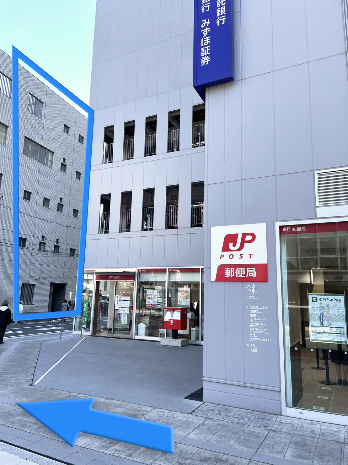 大通りまで真っ直ぐ進むと、交差点の向かいに大宮門街ビルがあります。郵便局が目印です。